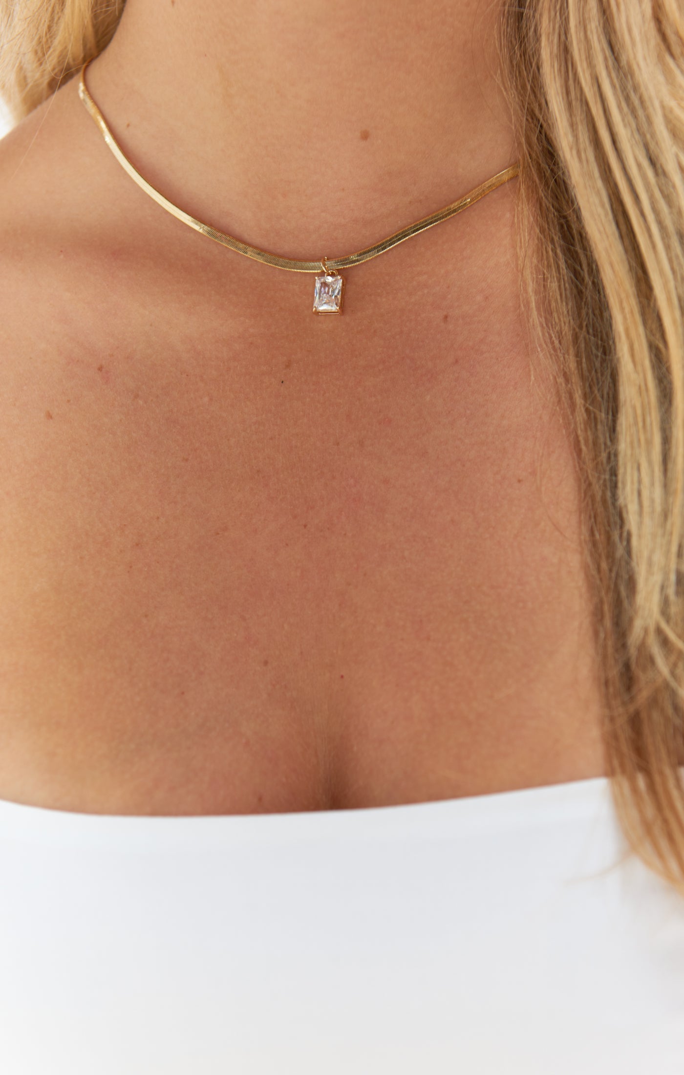 The perfect necklace to dress up or dress down! A large cz baguette charm paired with a thin snake chain necklace!
