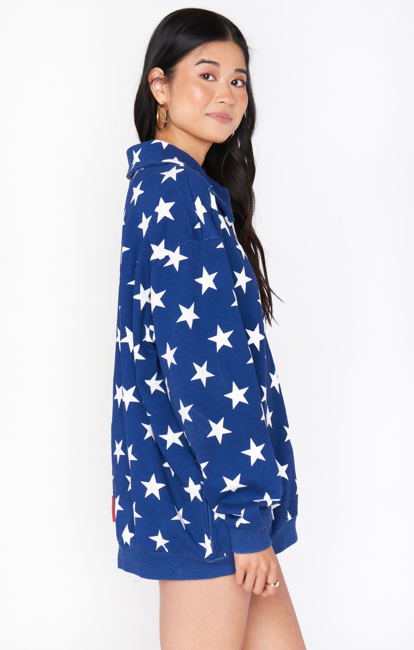 Beachy nights are so right in this patriotic, loose fitting oversized half zip. Throw over swim with your fave Mumu denims for the look of the summer!