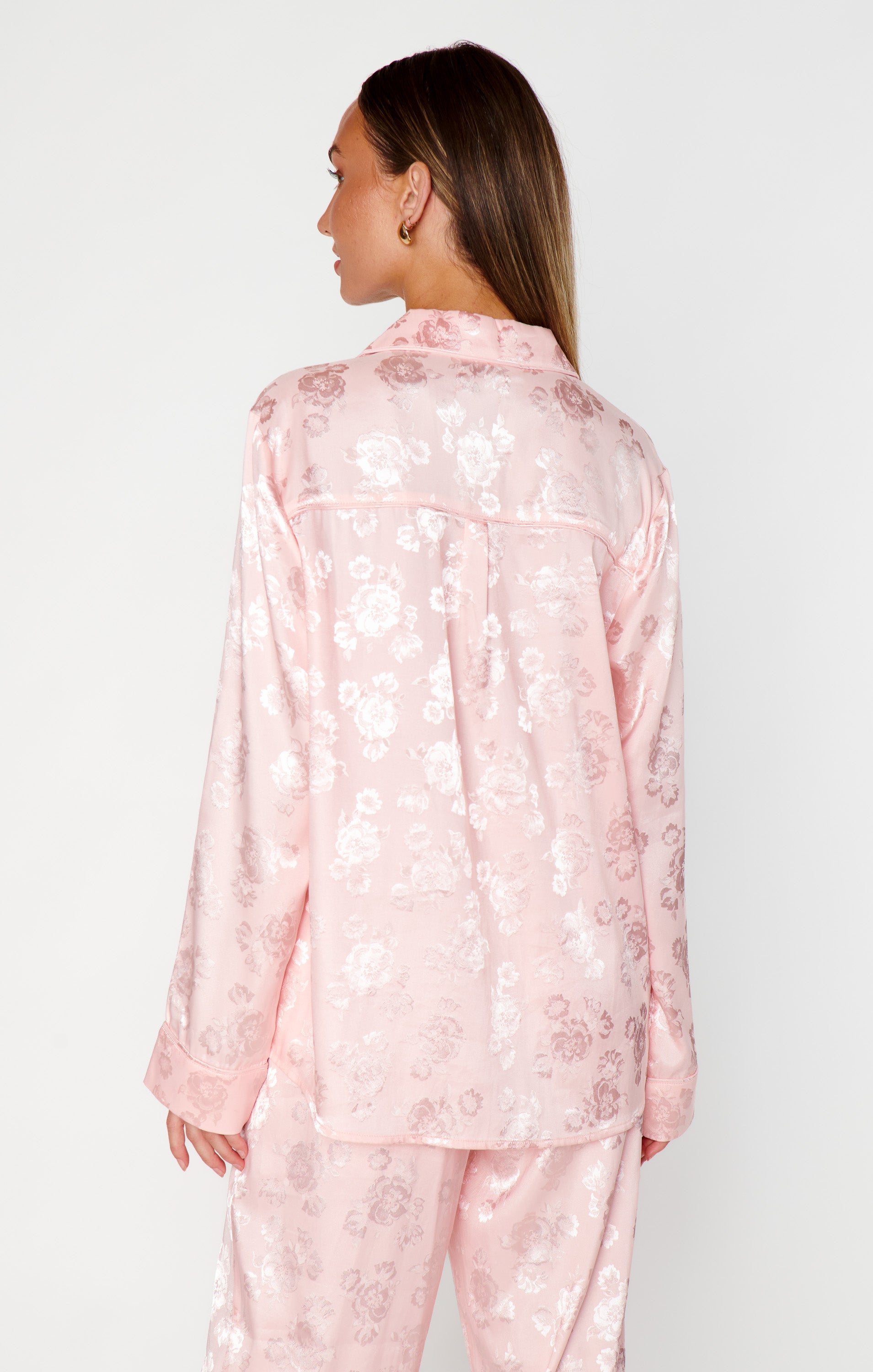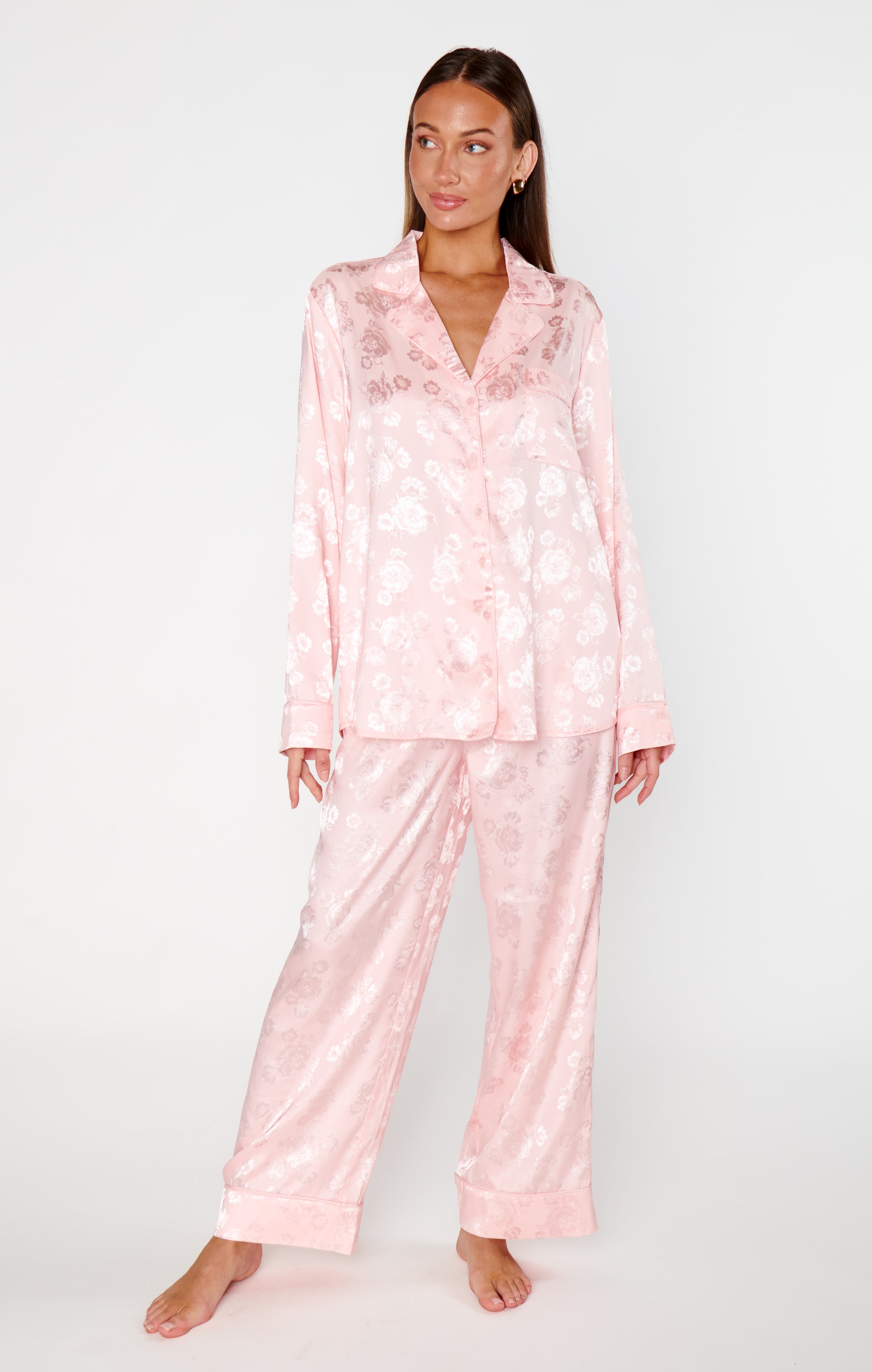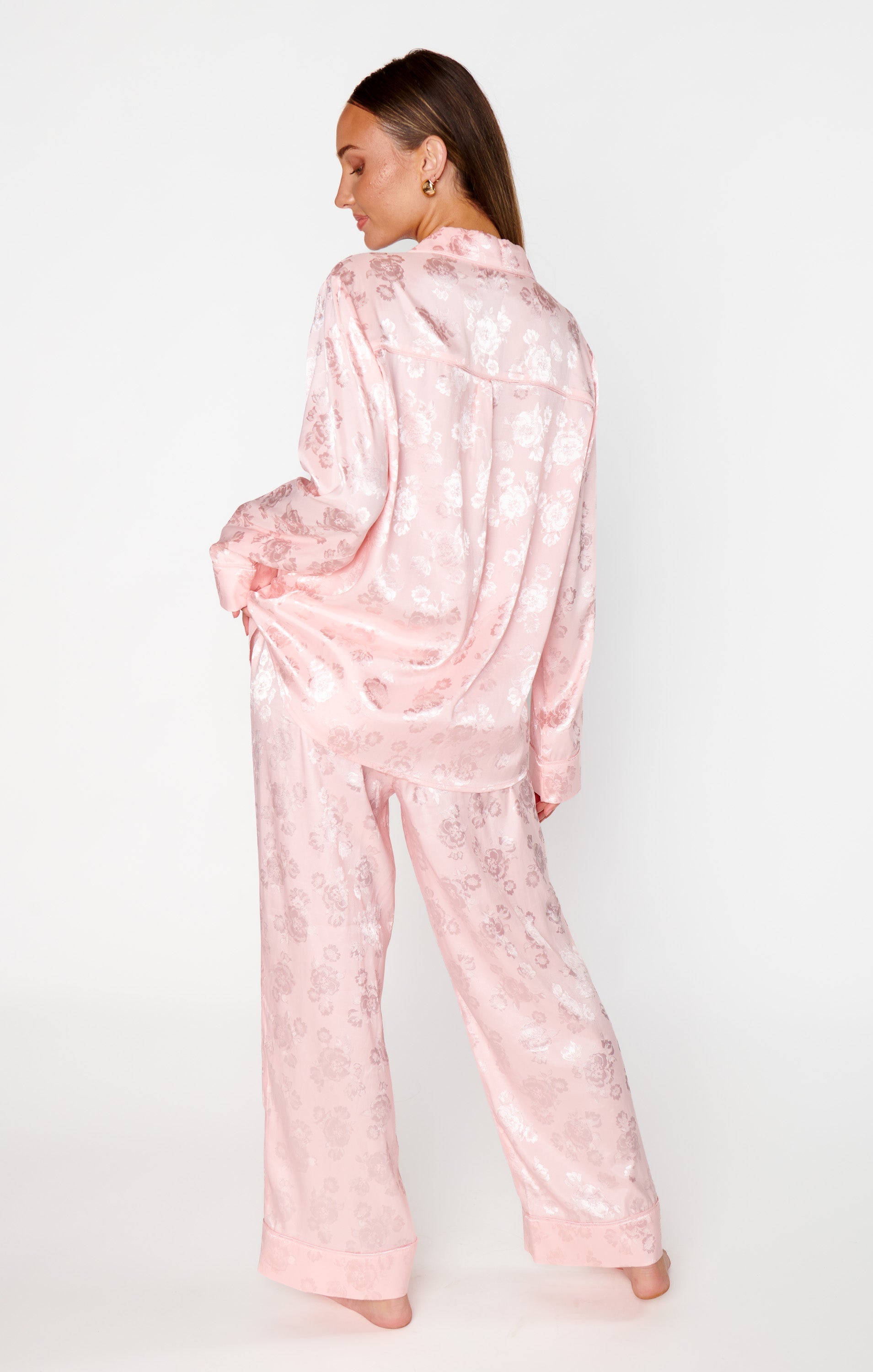 Get ready in these super silky button down pajamas! Sold as a set, these classic pink floral pjs have a drawstring and elastic waist.