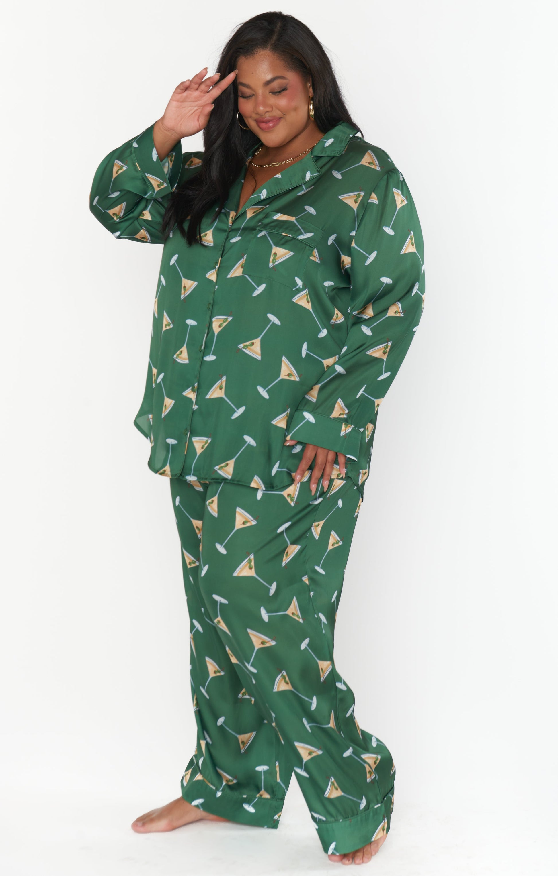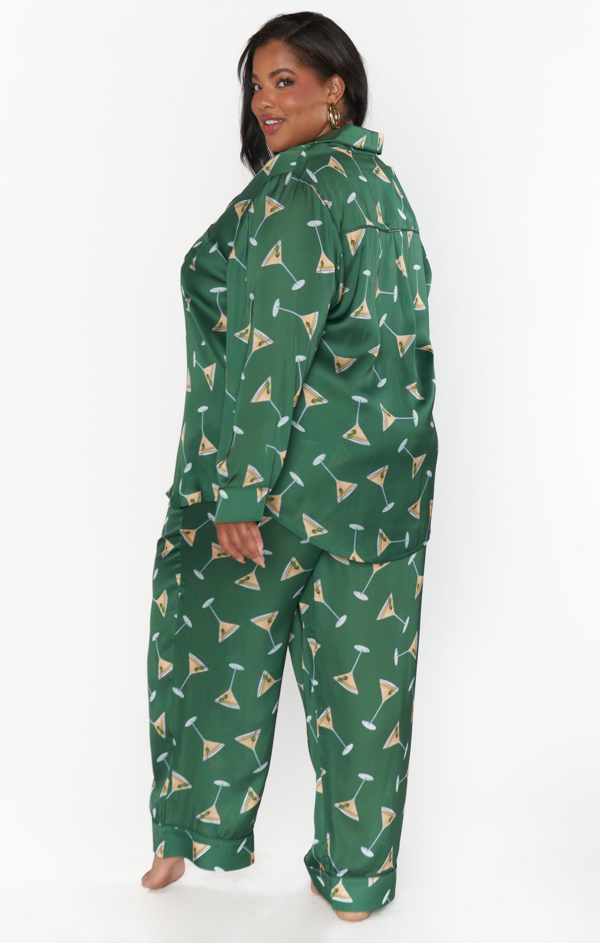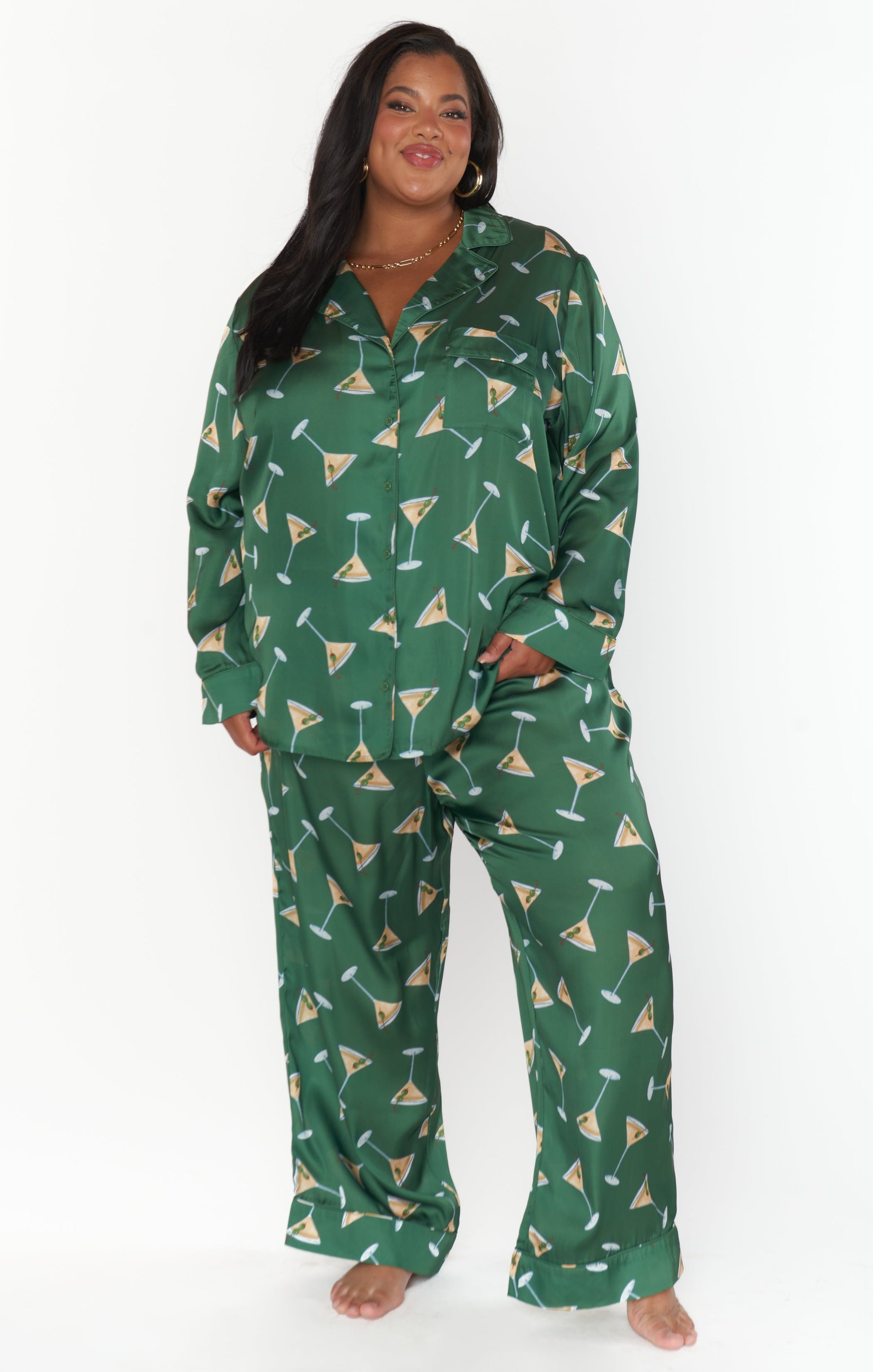 Sleep tight in these super silky button down pajamas! Sold as a set, these cheeky martini print pjs have a drawstring and elastic waist.