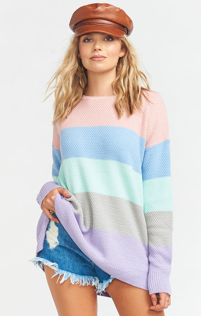 Perfect pastel stripped sweater featuring two small side slits and a high neckline. You'll be wanting to feel pretty in pastels all year long in this cozy stripped sweater!