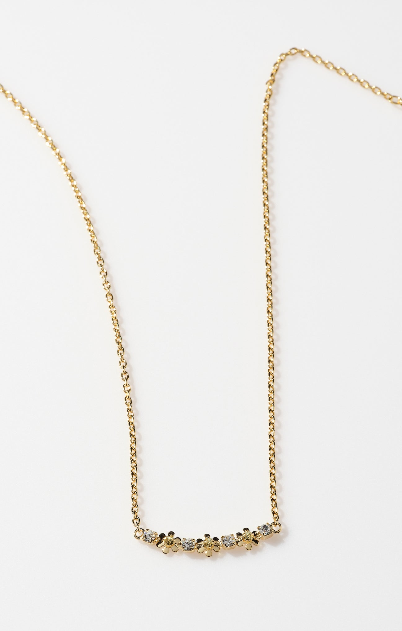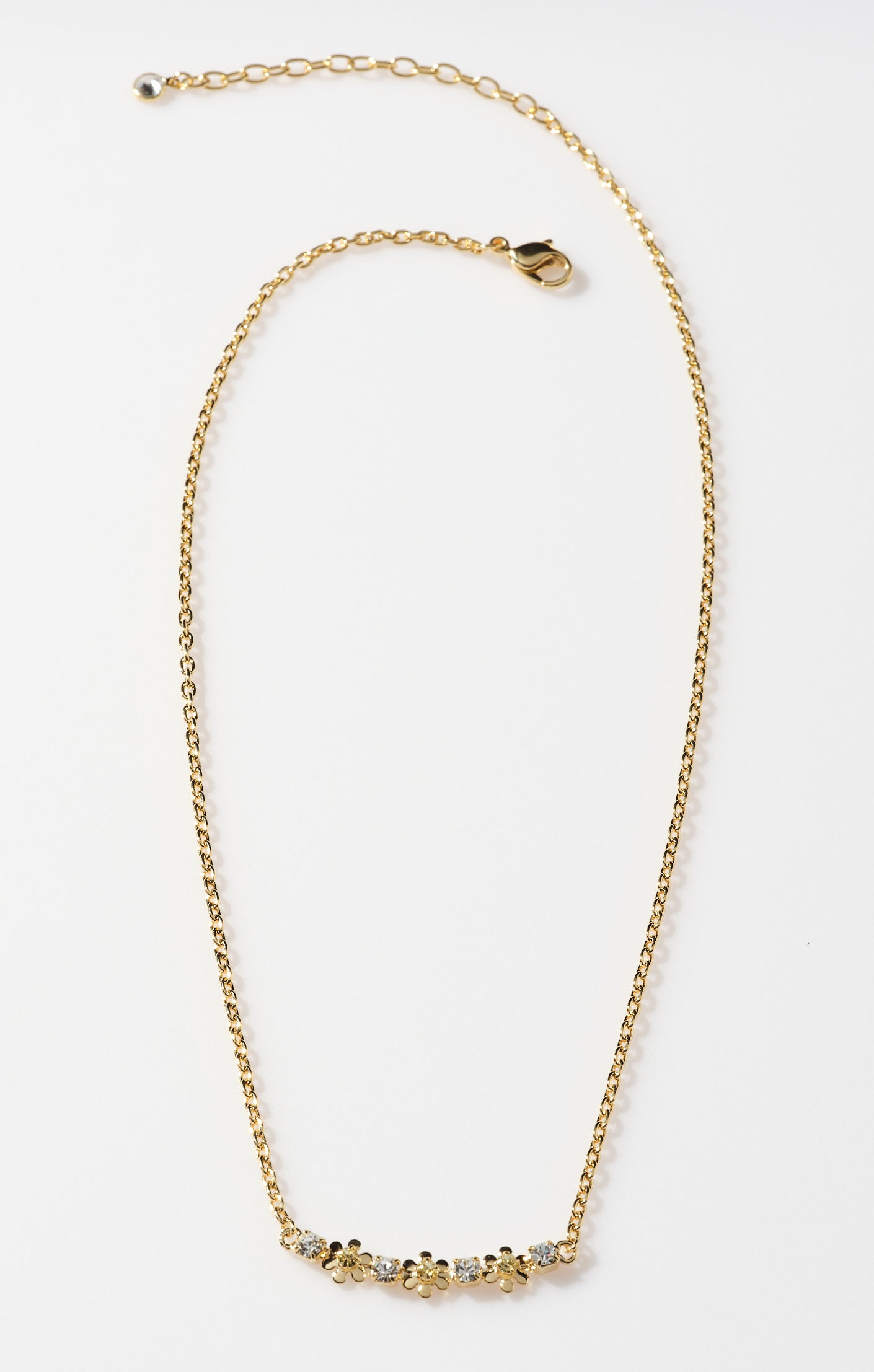Daisy with jonquil center mixed with crystals on a dainty gold chain.