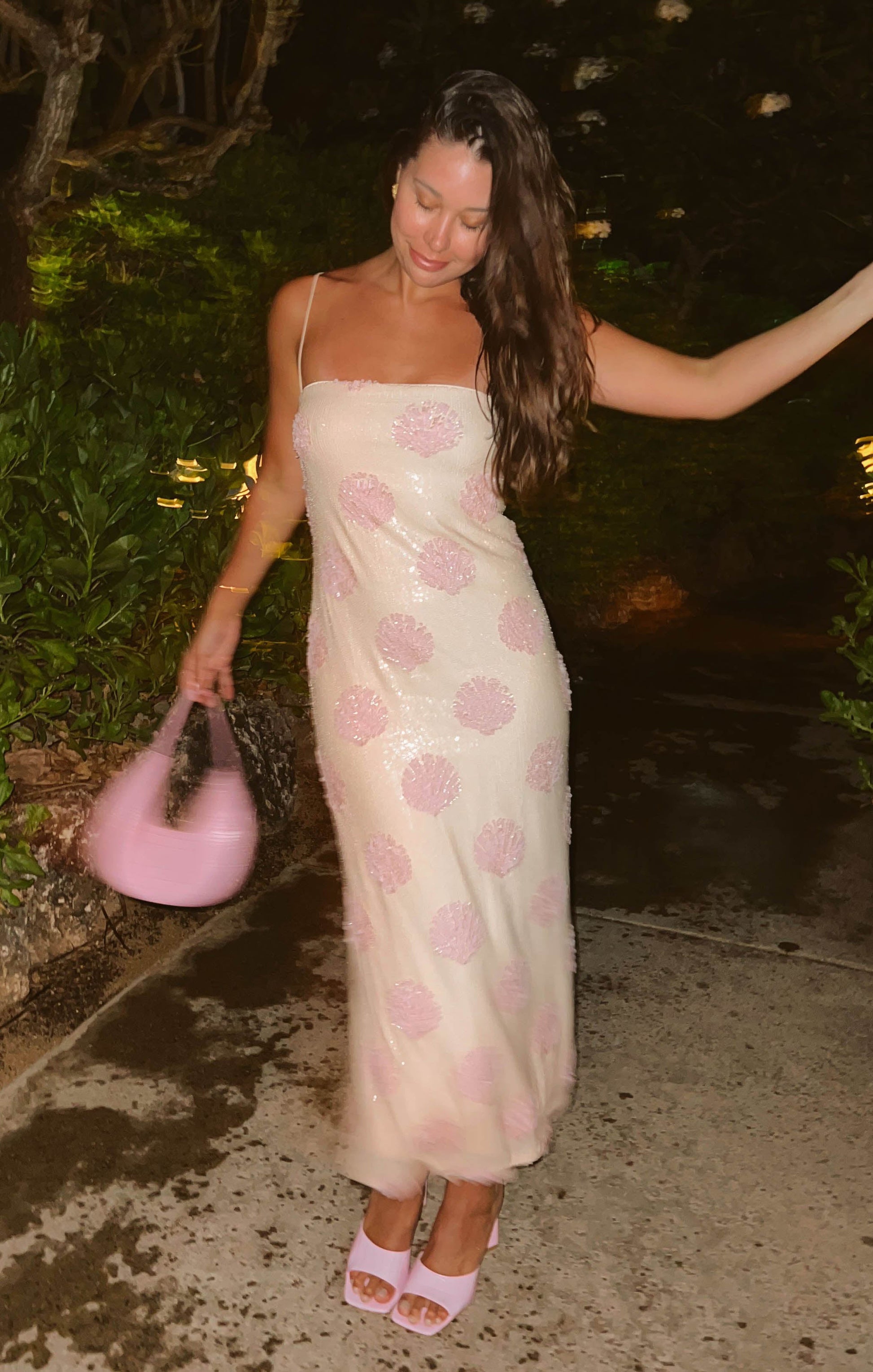 The Lizzy Dress brings all the seaside sparkle! Covered in shimmering sequins with a playful pink seashell pattern, this stunner is made for dancing under the cabana lights. With elastic spaghetti straps for support and a built-in shelf bra it’s equal parts comfy as it is eye-catching. Just add platform sandals and a cute clutch, and you’re set to shine!