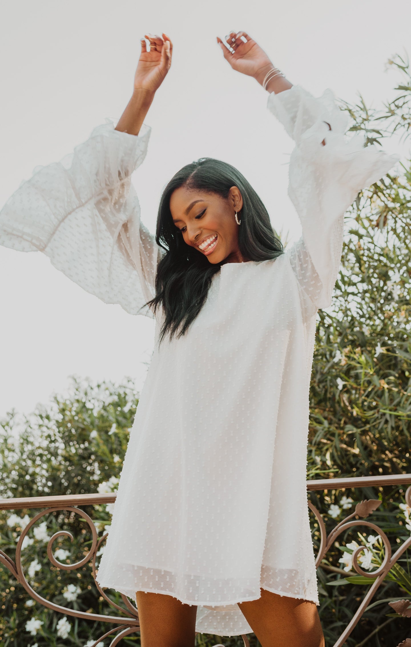 You'll marvel at this is a textured chiffon mini dress with breezy belled sleeves, her flowy silhouette and scooped neckline make her easy to throw on for an effortless and easy style! A tie accross your back keeps her up where she's supposed to be but with all the benefits of a super low back!