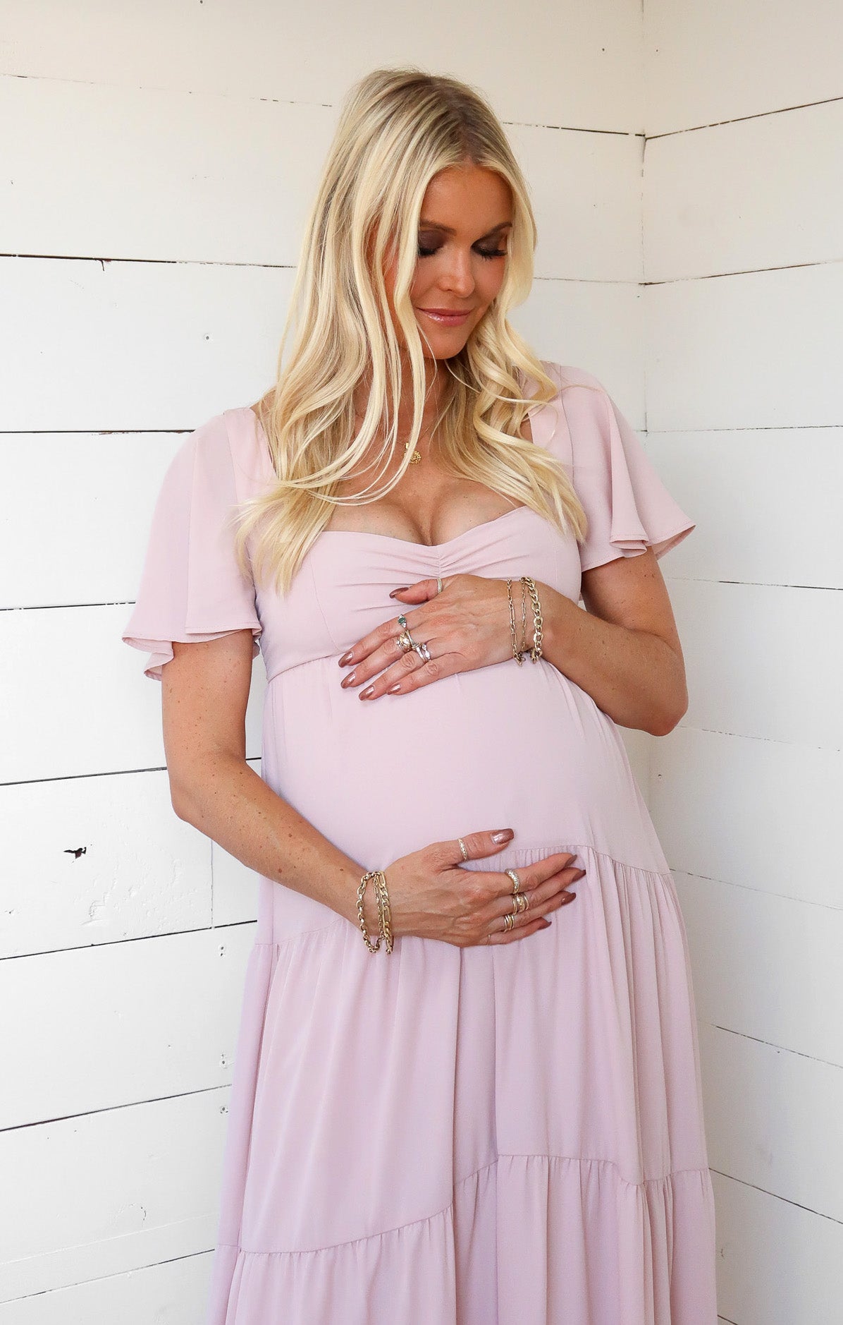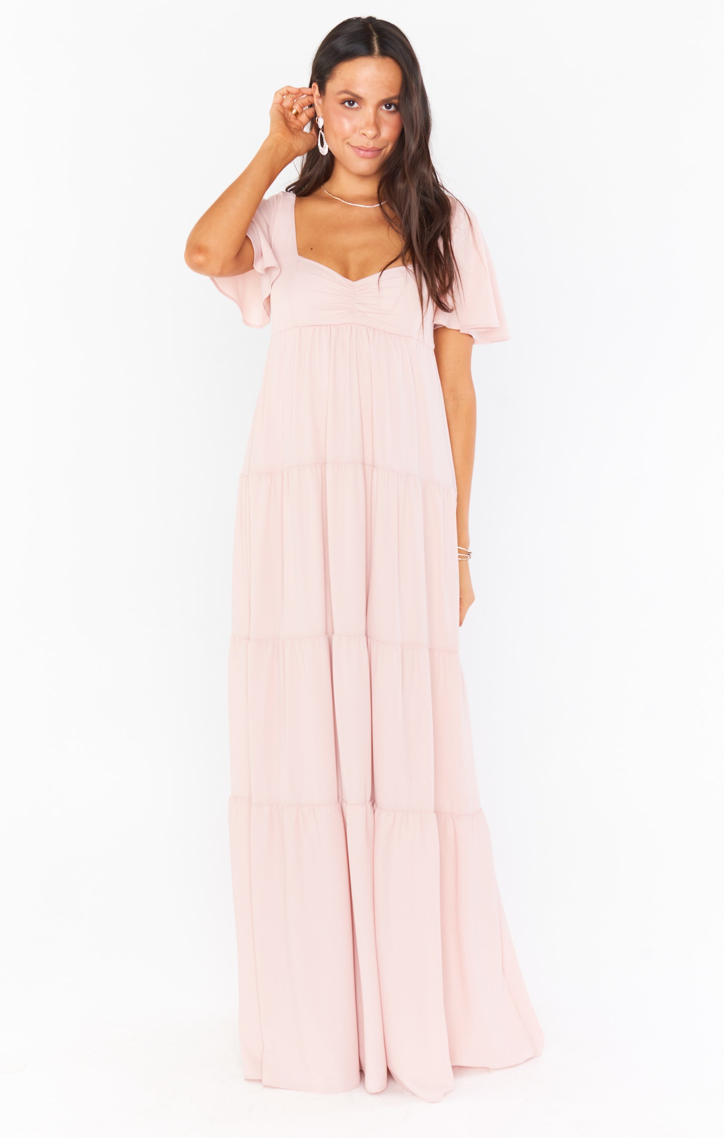 A winning combination of all our bestselling moments, this flattering maxi has a sweetheart neckline with a smocked back to ensure a perfect fit on your bust. Flutter sleeves offer dainty coverage and a tiered skirt adds the ultimate boho flow! The empire waist makes this a great maxi dress for moms to be! So whether you're a bridesmaid or a momma with a special event to attend, the Nicole will take care of you.
