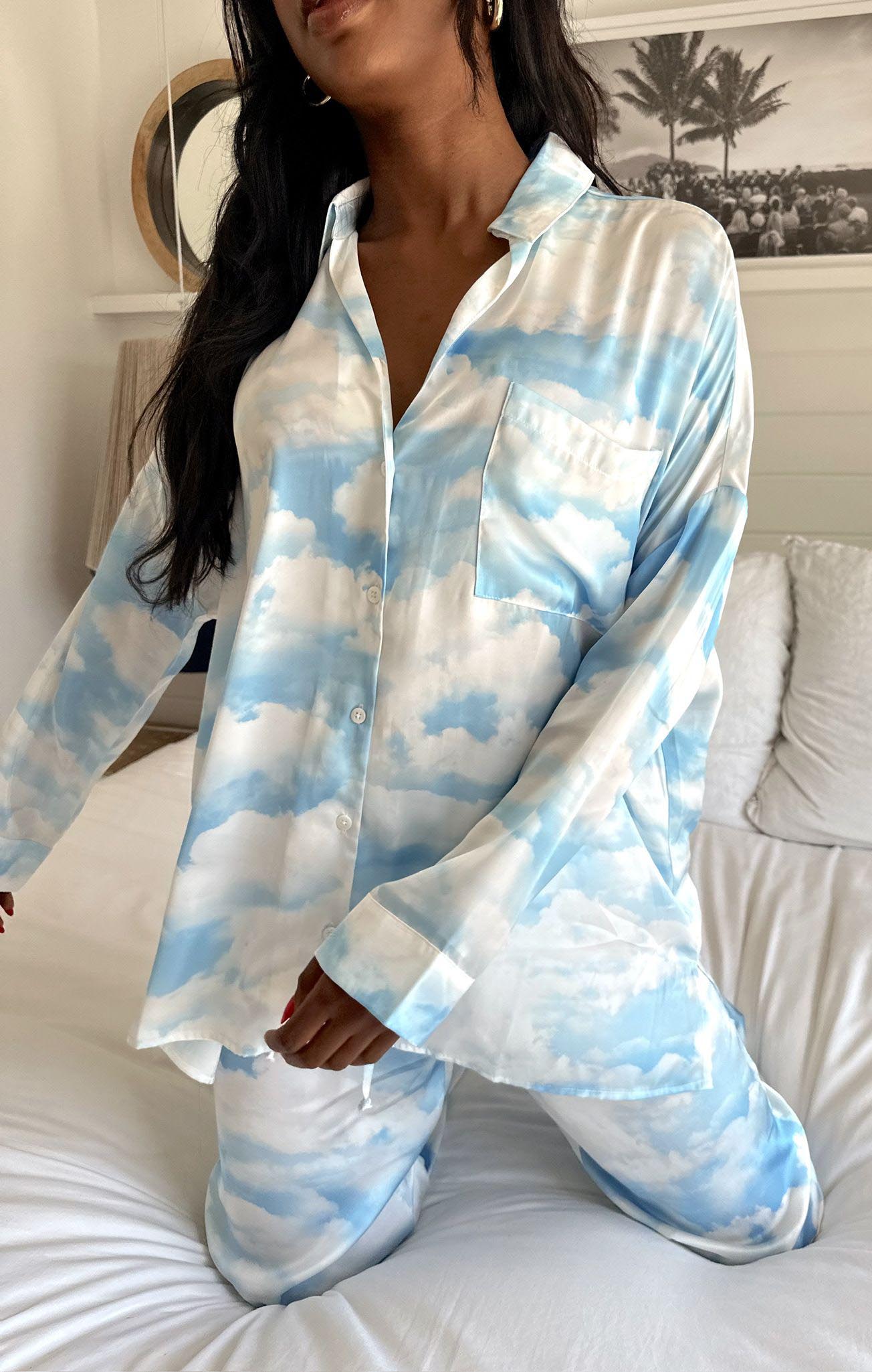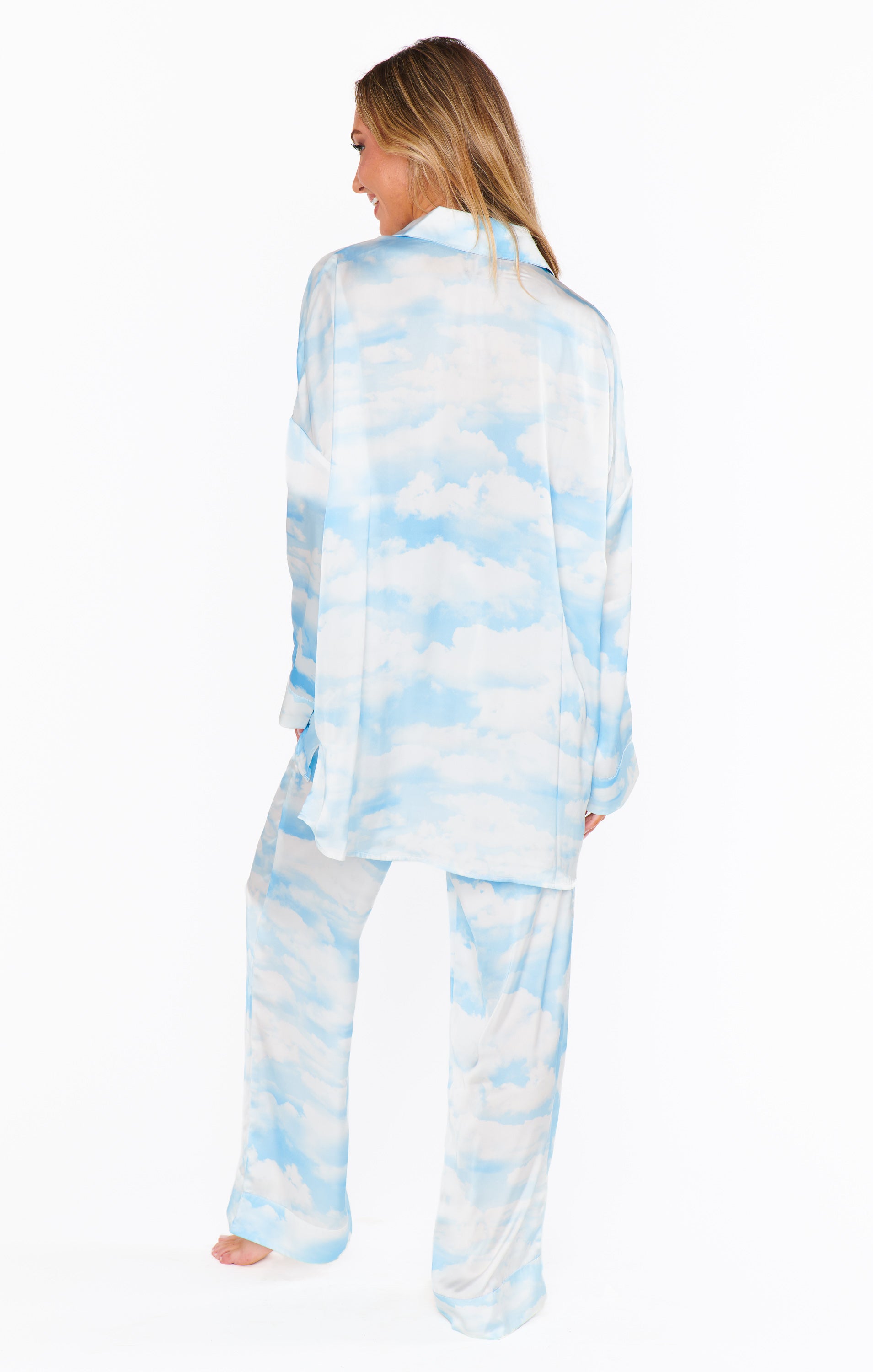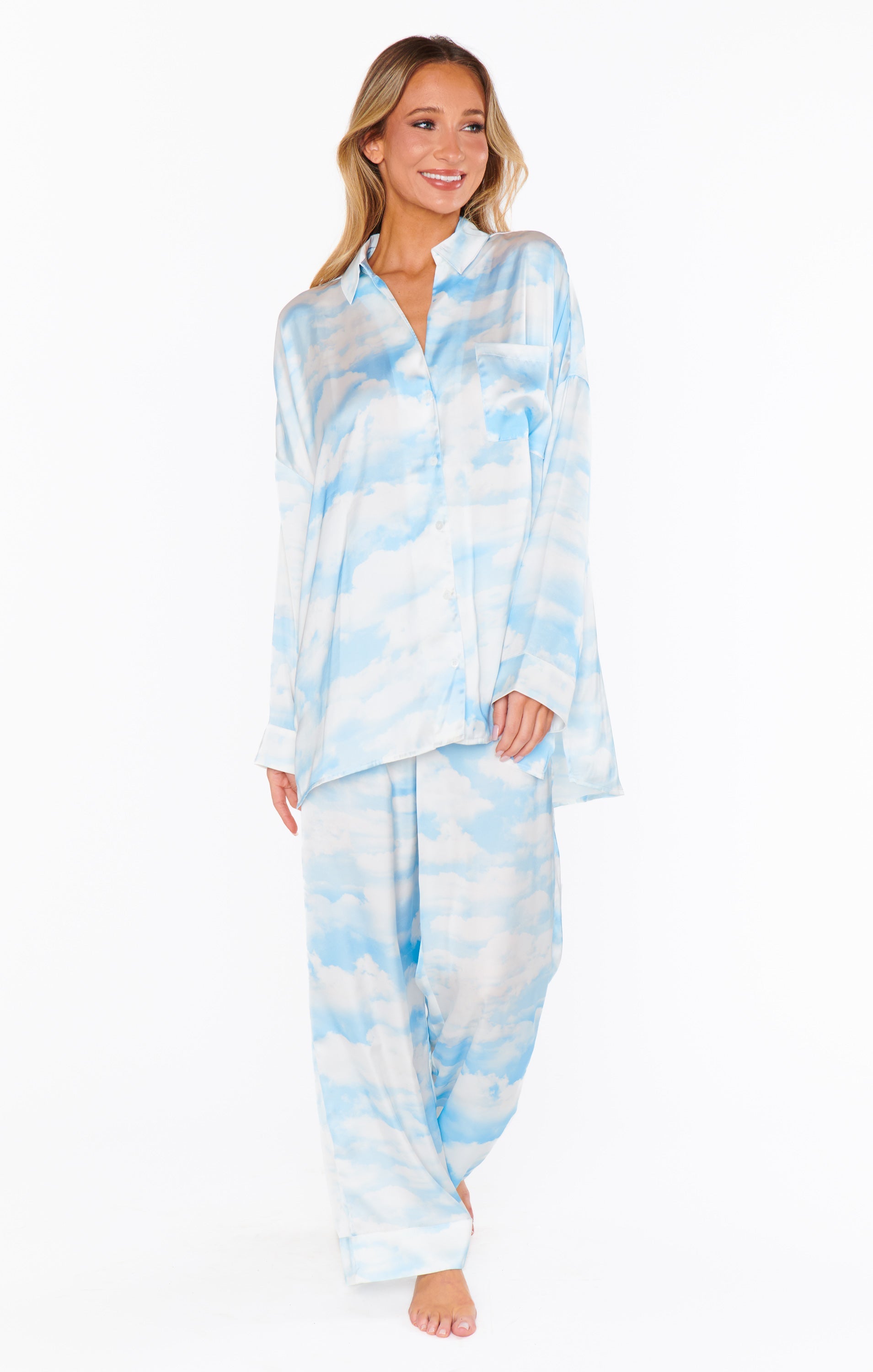 You may just oversleep in these super silky button down pajamas! Sold as a set, these super fun dream cloud pjs have a drawstring and elastic waist.