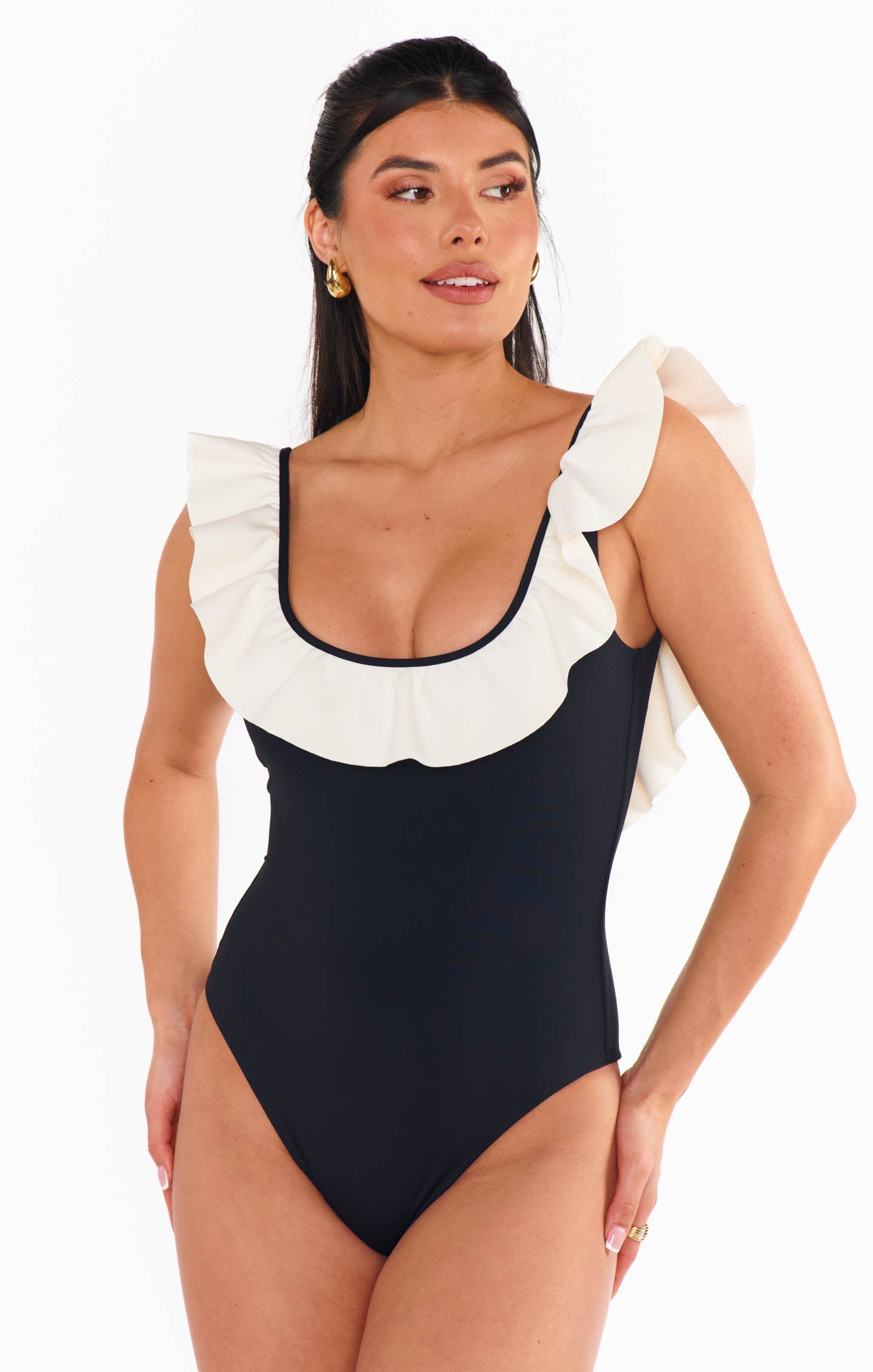 Elevate your pool days in our Ritz One Piece! Contrasting white ruffle detailing and a scoop back provide elevated charm while you lounge in the sun. Pair this cheeky one-piece with our Paula Pullover for a neutral, matching moment!