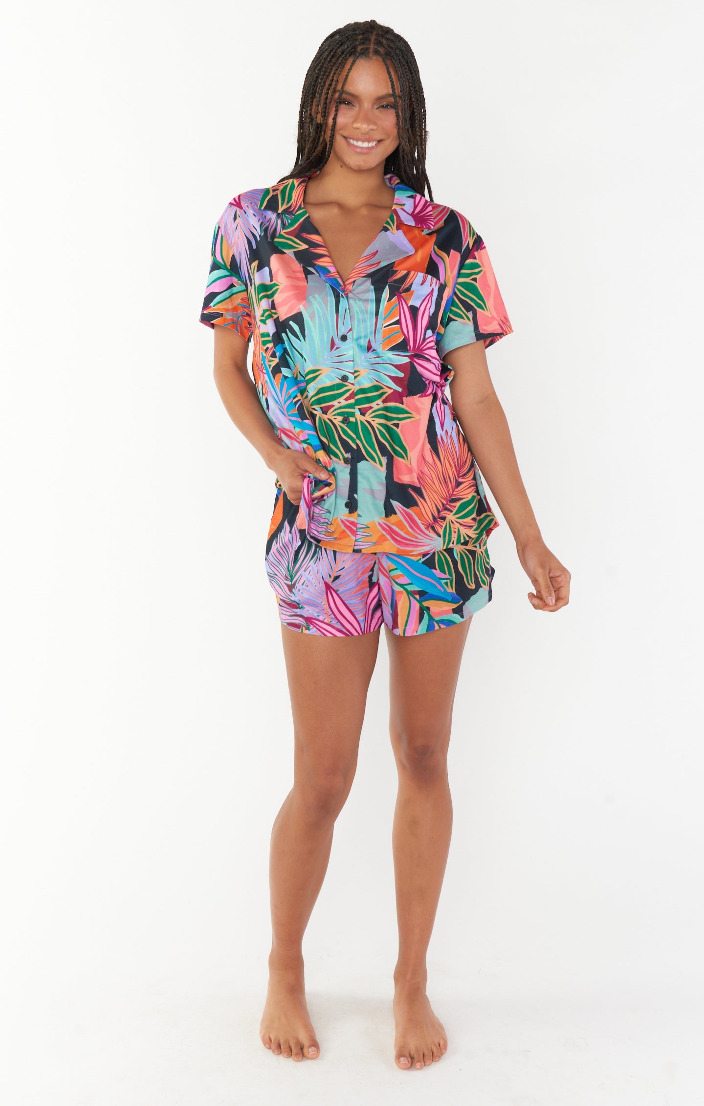Easy like Sunday morning! This tropical palm printed PJ set will make it easy to sleep in all weekend long. This set has a front pocket, a button down top, and an elastic waist on the shorts. Throw on a pair of your fave slippers and you'll be ready to snuggle up!