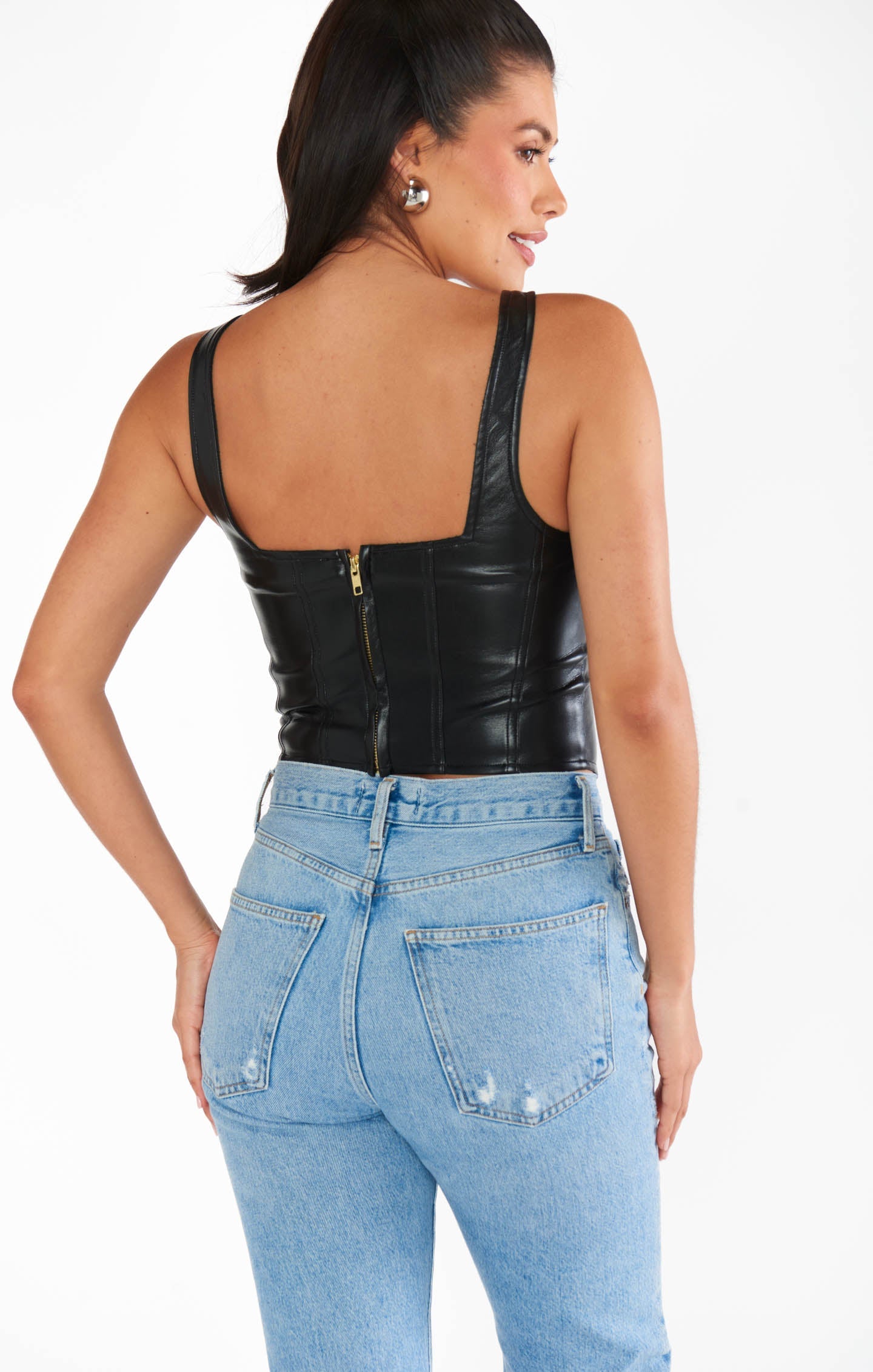 Look no further, your fave going out top is here! Tight in all the right places, this corset style top pushes up the girlies. Sleek and stylish, complete the faux leather look with our Tyra Mini Skirt and Penny Lane Coat.