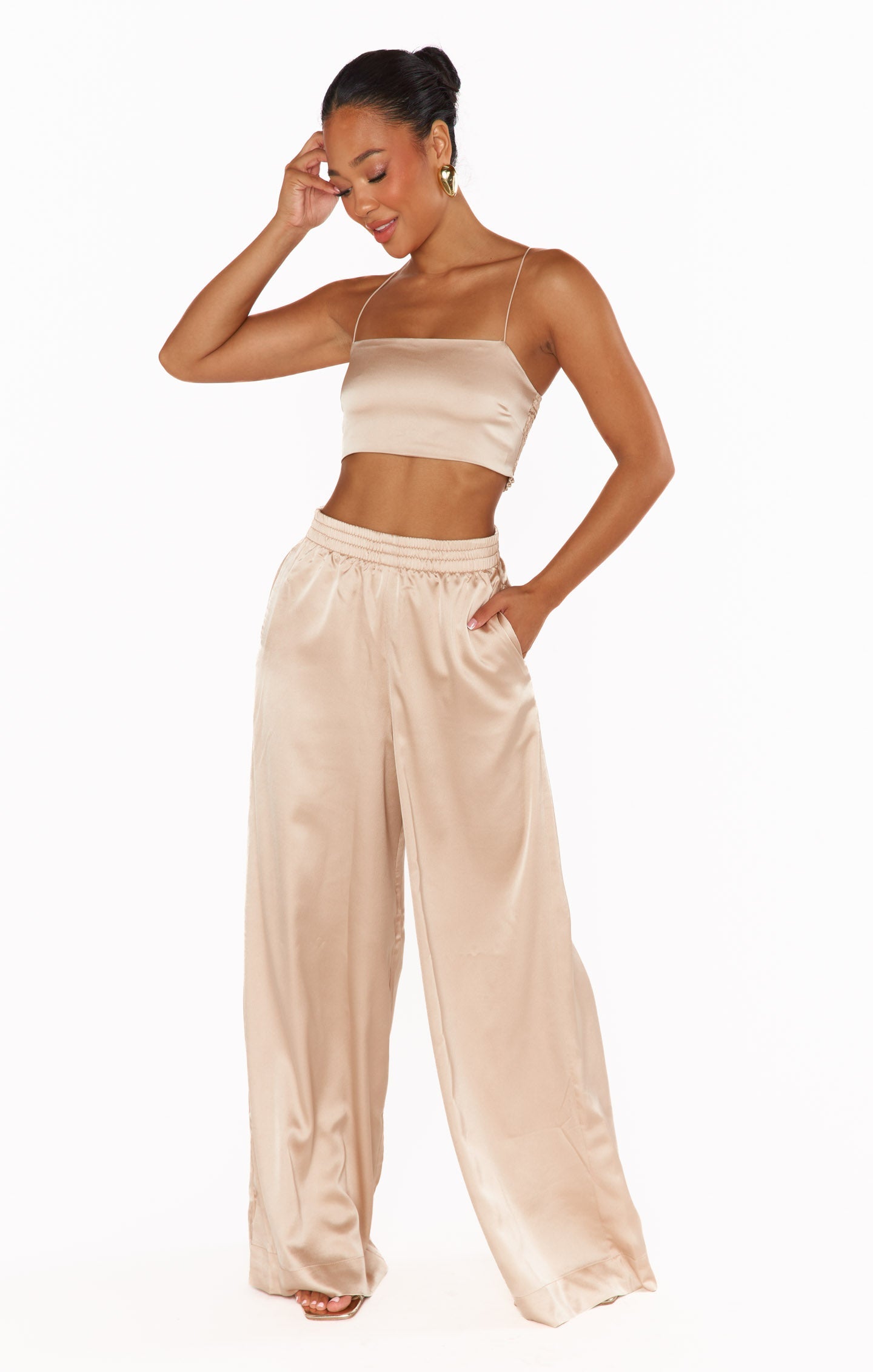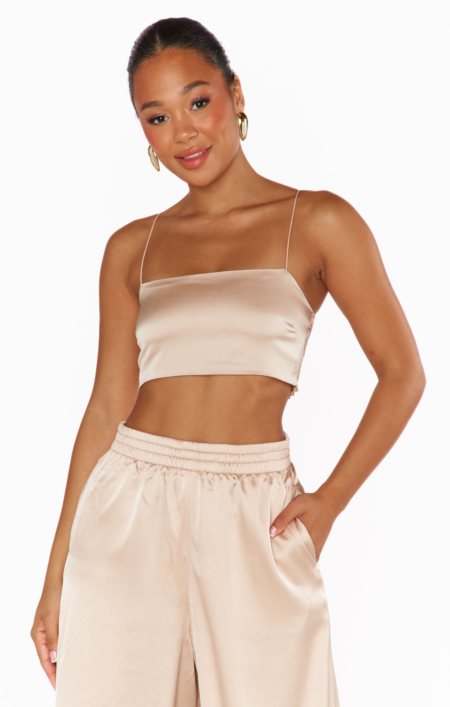 Turn heads in the luxe satin Tucker Top. This silky little number features a straight neckline with spaghetti straps and a smocked back for the perfect fit. An absolute vibe paired with the Irwin Pants and simple earrings.