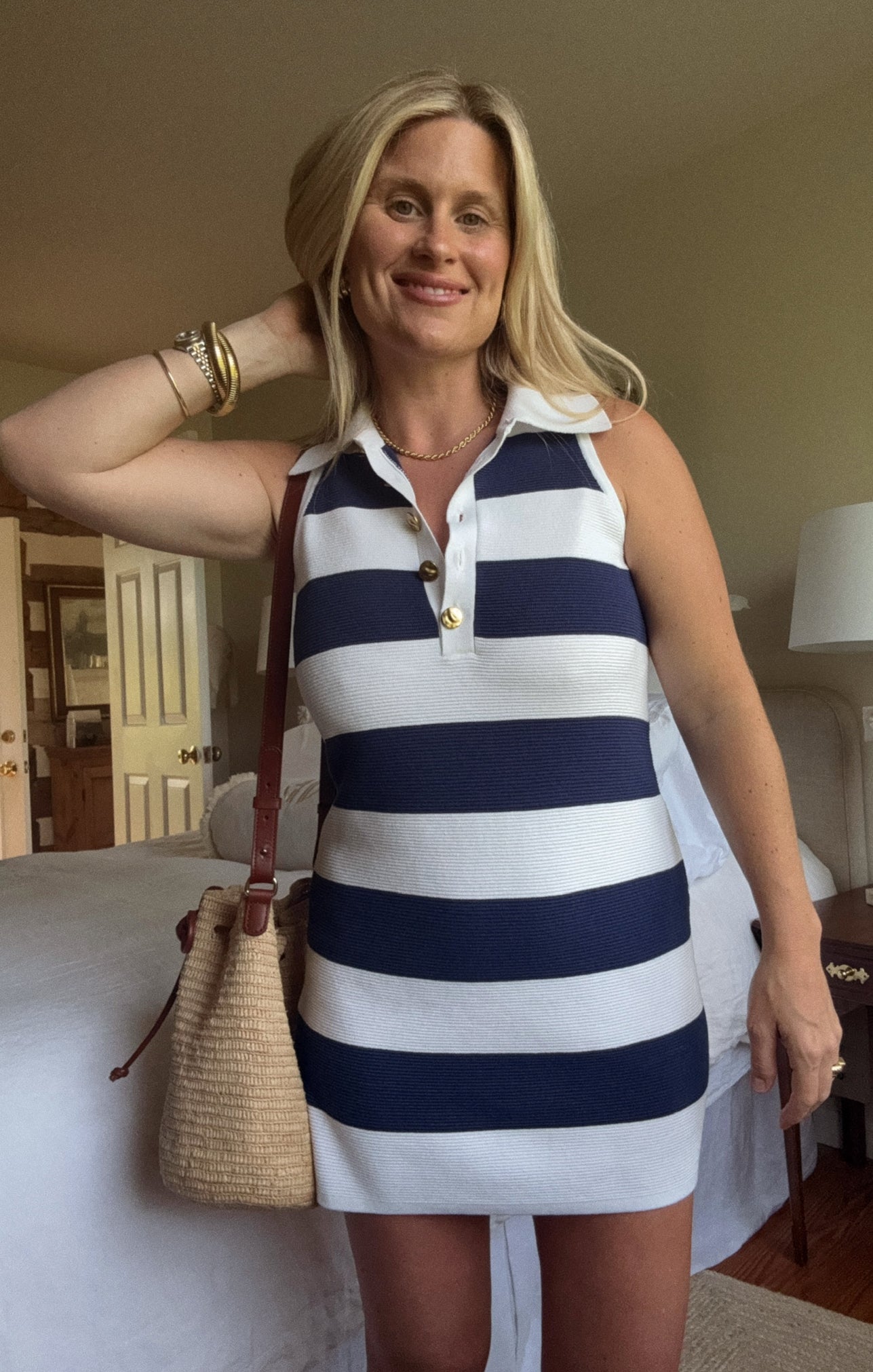Kick-off summer in the Zoe Button Dress! Stripe printed knit shape this sleeveless mini, featuring a quarter button high neck you can adjust to your liking. The perfect 4th of July 'fit styled with platform sneakers.